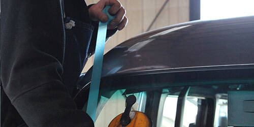 ガラスと接着剤を専用の道具を使って切り離し、割れたガラスを取り外します。